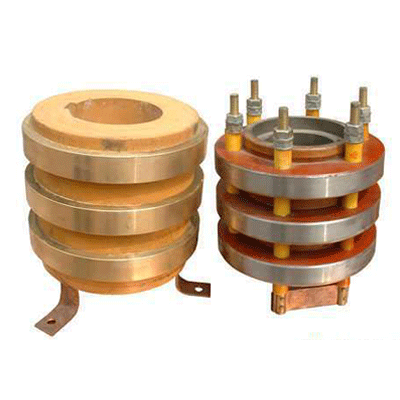 電滑環,在所有滑環系列中使用最廣泛,也稱電刷、碳刷、集電環、集流環、匯流環、旋通、旋轉電氣關節,專用于在無限制連續旋轉時,傳輸功率電源、信號電源。定子與轉子部分分別引出導線連接固定結構與旋轉結構的電源與終端電器,并隨之旋轉。根據其整體結構的不同,分為實圓滑環(在旋轉體上挖一個孔,安裝滑環),(如圖),空圓滑環(將滑環安裝在旋轉軸上)(如圖),以及分離滑環、扁盤滑環、水銀滑環、特型滑環等等。